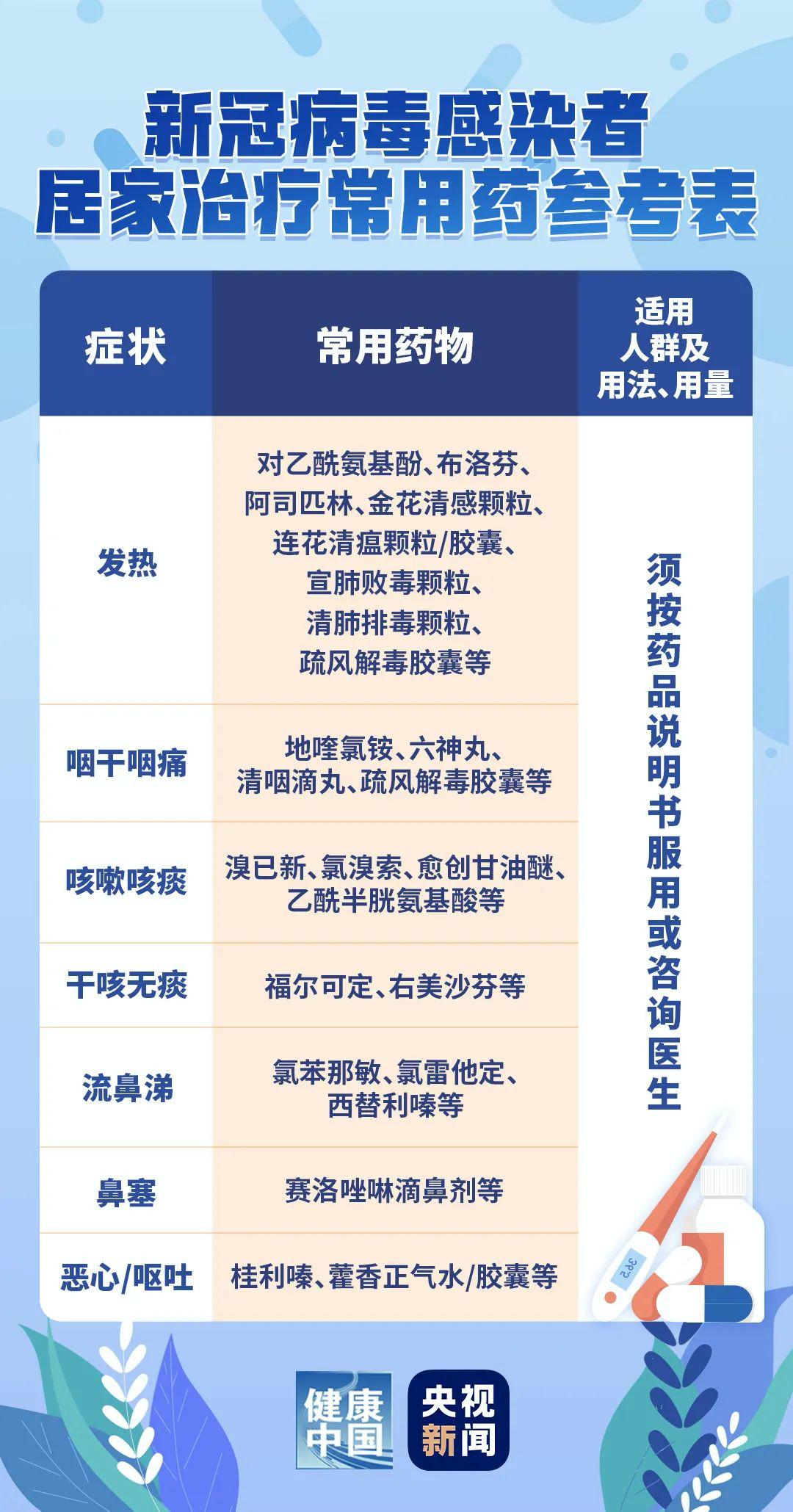 12月8日,央視網轉載國家衛健委官網發布新冠感染者居家治療指南。針對可以居家治療的新冠病毒感染者可能出現的7種症狀推薦了家庭常用參考藥物。圖表如下: